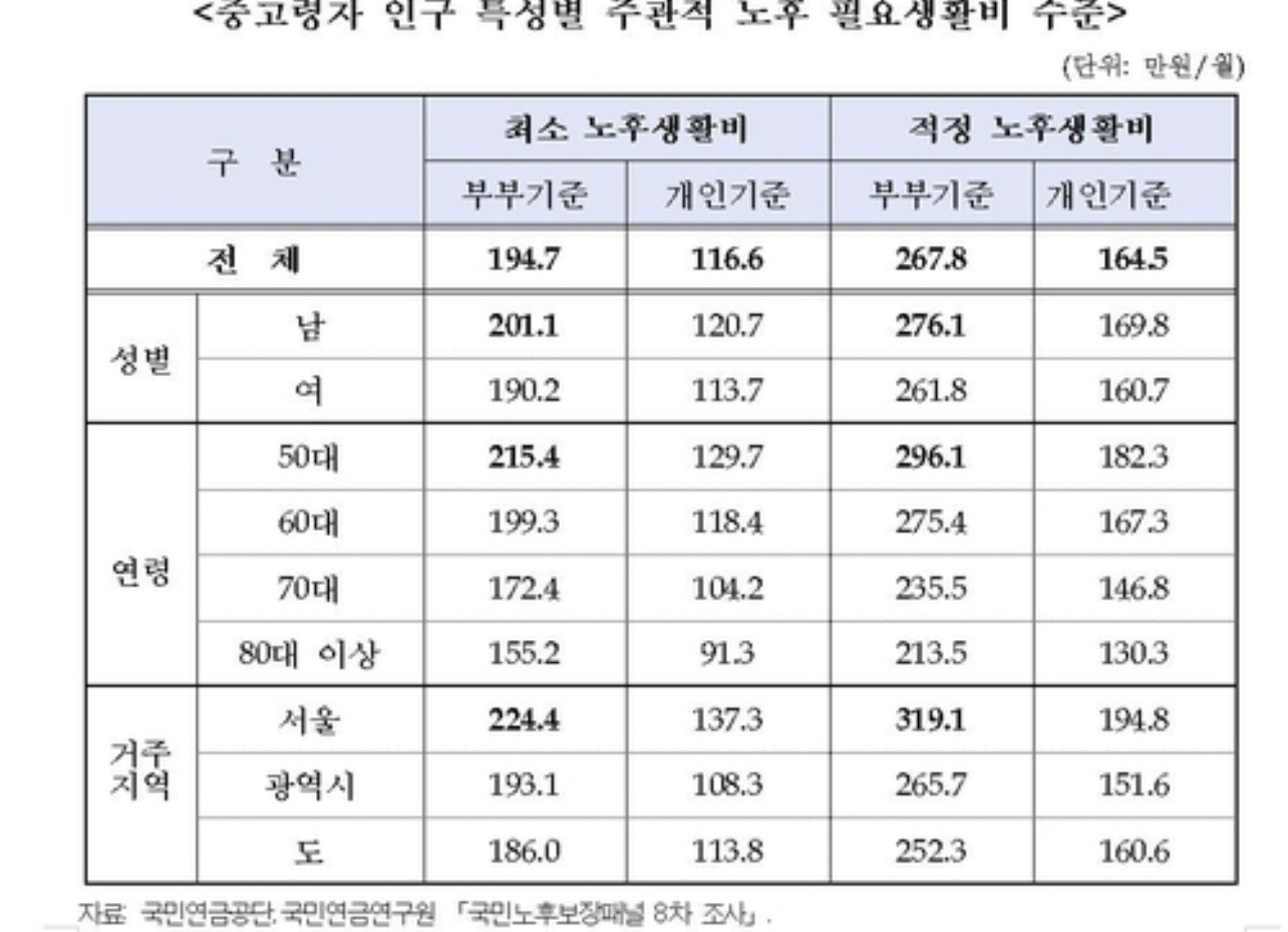 국민연금공단 국민연금연구원이 2020년에 발표한 '국민노후보장패널' 8차 조사 결과를 바탕으로 노후에 필요한 최소 생활비와 적정 생활비를 소개합니다. 이 조사는 전국 50세 이상 가구원이 있는 4천531 가구 (개인 7천343명)를 대상으로 실시된 것으로, 주관적 인식에 따라 노후에 필요로 하는 월 생활비 수준을 조사한 것입니다.(노후 적정 생활비 얼마로 여길까… 부부 월 268만 원-개인 165만 원)
