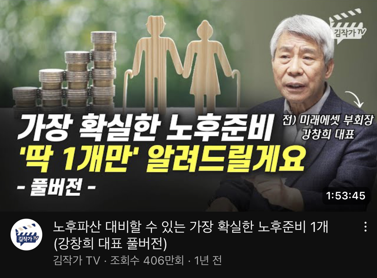 이번에는 노후파산 대비할 수 있는 가장 확실한 노후준비에 대해 알아보겠습니다. 강창희 대표님께서 김작가 TV 유튜브에서 1년 전에 방송하신 영상을 바탕으로 정보를 제공해 드리겠습니다.
