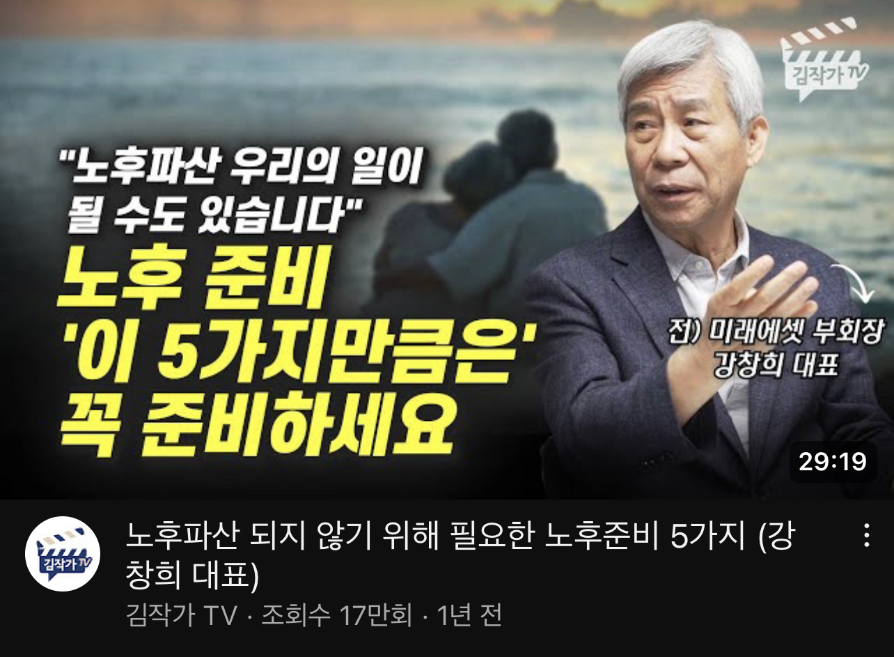 이상으로 유튜브 김작가 TV에서 강창희 대표에게 듣는 노후파산하지 않기 위해 필요한 5가지에 대해 알아보았습니다. 이 글이 여러분의 노후준비에 도움이 되기를 바랍니다.