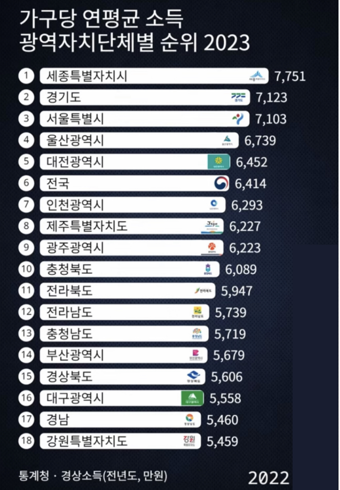 2023년 한국의 지역별 소득과 빈부격차 현황 (통계청, 2023년 1분기)