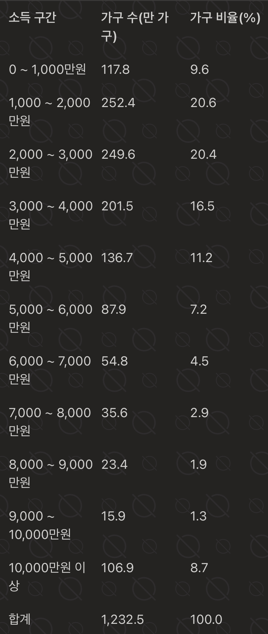 통계청의 2022년 가계동향조사에 따르면, 우리나라 전체의 소득 분포도는 다음과 같습니다.