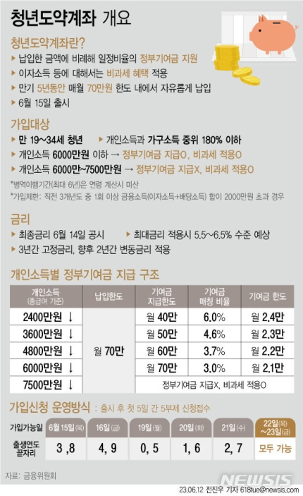 - 15일부터 23일까지 '청년도약계좌' 취급 은행 앱을 통해 비대면으로 가입 신청이 가능합니다. 접수 시간은 오전 9시부터 오후 6시 30분까지입니다.