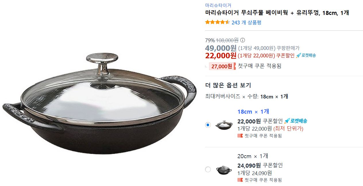 - 무쇠 죽냄비 추천: [마리슈타이거 무쇠 주물 18cm]