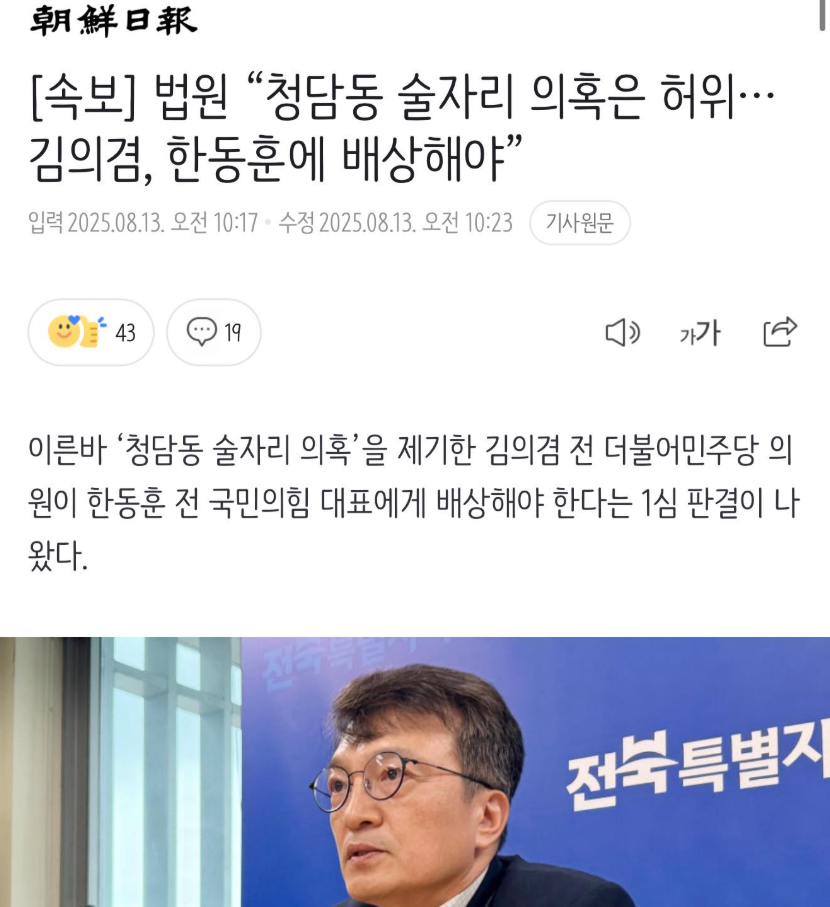 “국민의힘 한동훈 전 대표가 ‘청담동 술자리 의혹’을 제기한 김의겸 새만금개발청장 등을 상대로 제기한 손해배상 청구 소송에서 승소했다. 서울중앙지법 민사합의 14부(정하정 부장판사)는 2025년 8월 13일, 김 청장 등에게 총 8,000만 원을 배상하라고 판결했다 — 김의겸 등 5명은 7,000만 원, 최초 제보자는 1,000만 원을 각각 배상해야 한다는 결정이다.”