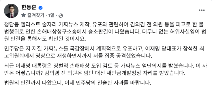 한 전 대표는 판결 직후 페이스북에 관련 소식을 공유하며 민주당에 공식 사과를 요구했습니다.