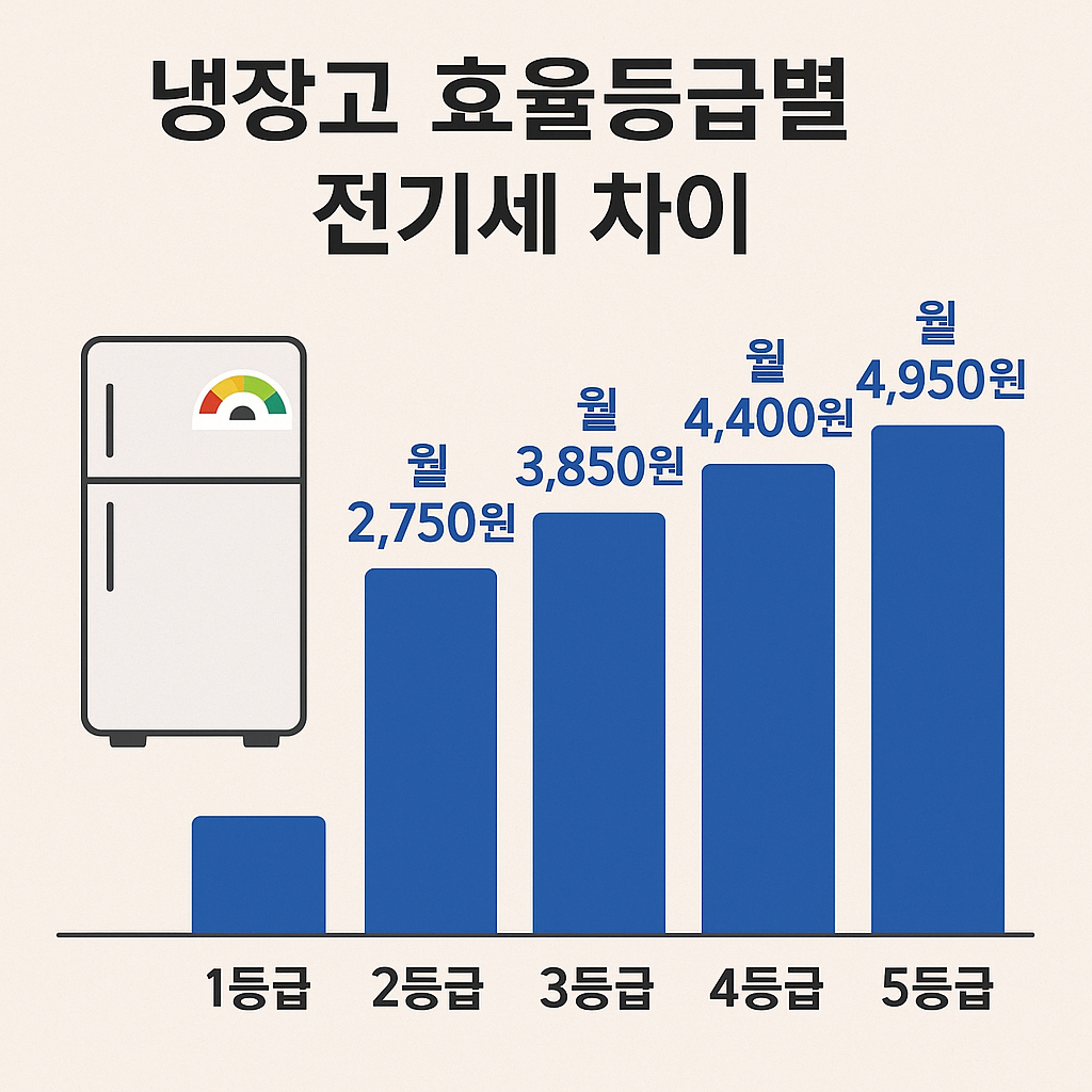 - 5등급 냉장고 (300L 기준) → 월 약 45kWh 사용 → 월 전기세 약 4,950원