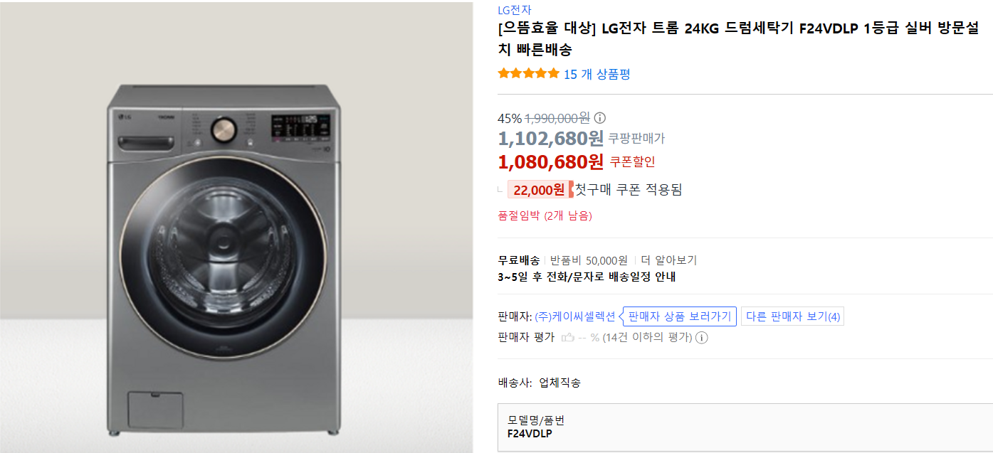건조기는 사용 시간이 길지는 않지만, 소비전력이 크기 때문에 효율 등급에 따른 전기세 차이가 뚜렷하게 나타나는 가전입니다.