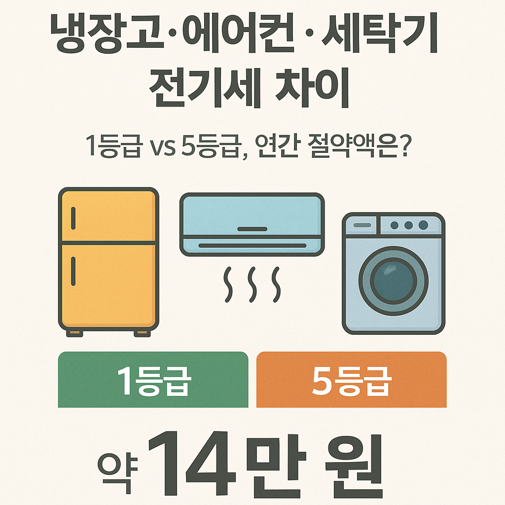 2025년 냉장고·에어컨·세탁기 전기세 차이를 1등급과 5등급 사례로 비교했습니다. 단계별(1~5등급) 전기요금 표와 연간 절약액까지 정리해 고효율 가전 교체 효과를 쉽게 확인할 수 있습니다