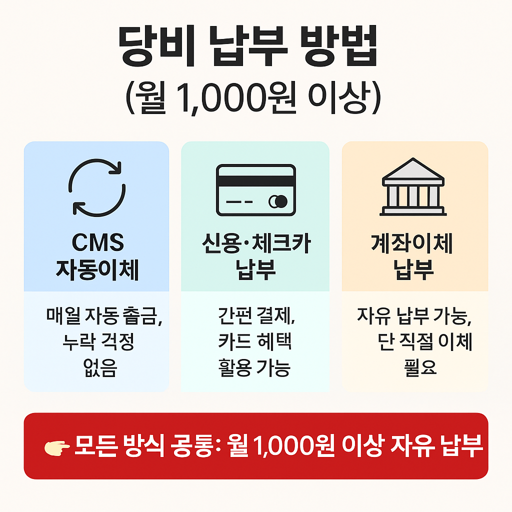 → 매월 일정 금액(보통 1,000원 이상)을 꾸준히 납부해야 하며, CMS 자동이체 방식이 일반적입니다.