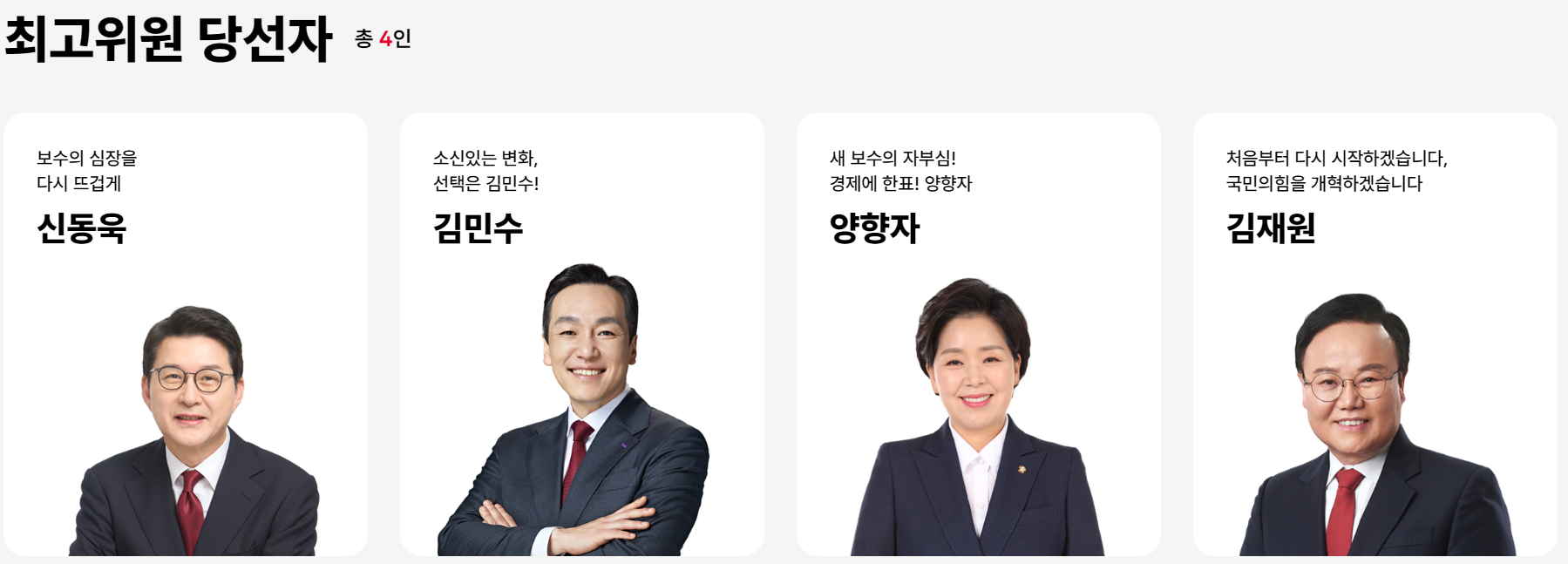 - 최고위원 당선자: 신동욱, 김민수, 양향자, 김재원