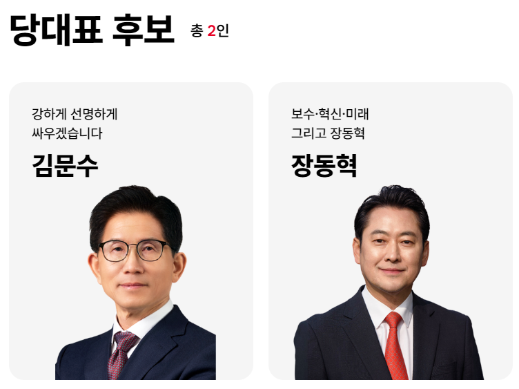 - 결선 진출자: 김문수 전 고용노동부 장관, 장동혁 의원