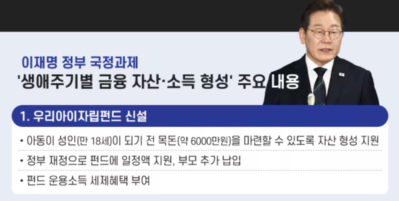 | 우리아이자립펀드 | 출생 아동 전원 (보편 지원) | 부모 저축 + 정부 매칭 지원 구조, 장기 복리 효과로 최대 6000만 원 형성 가능 |