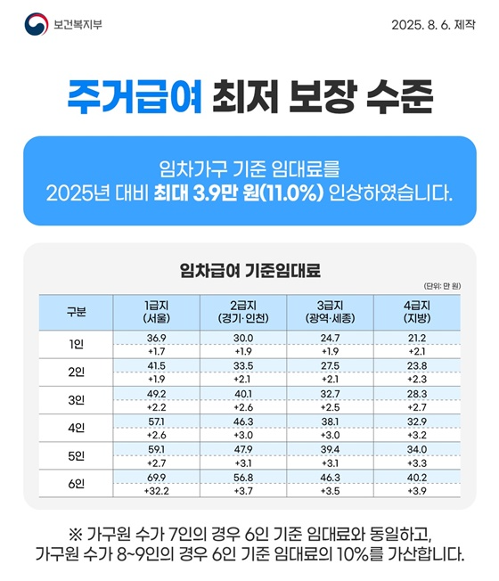 | 주거급여 | 기준임대료 4.7~11% 인상 | 월세·전세 부담 완화 효과 |