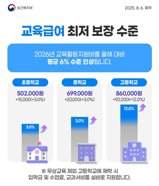 | 교육급여 | 초 50만 2,000원, 중 69만 9,000원, 고 86만 원으로 평균 6% 인상 무상교육 제외 고교 입학금·수업료·교과서비 실비 지원 |