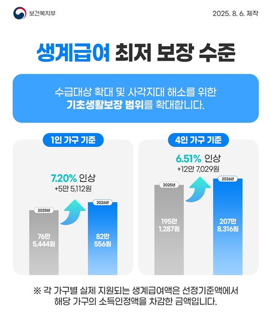 | 생계급여 | 1인 가구 82만 원, 4인 가구 207만 원 수준으로 인상 |