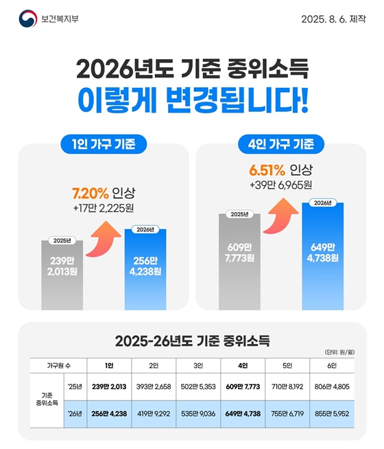 2026년부터 대한민국 기준 중위소득이 역대 최대 폭으로 인상됩니다.