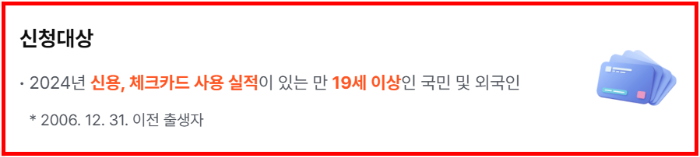 상생페이백 신청 대상은 만 19세 이상(2006년 12월 31일 이전 출생자)으로, 2024년에 본인 명의의 신용·체크카드 사용 실적이 있는 내국인과 외국인 모두 포함됩니다.