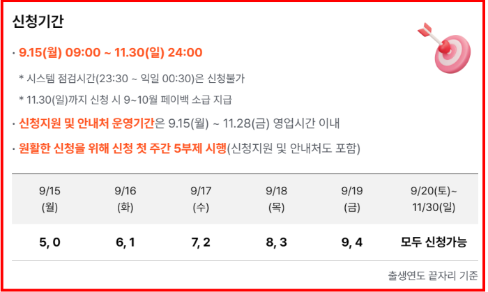 반드시 11월 30일까지 신청해야 하며, 신청 첫 주(9월 15일~19일)는 출생년도 끝자리 기준 5부제 신청이 적용됩니다. 이후에는 누구나 자유롭게 신청할 수 있습니다.