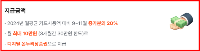 2024년 월평균 카드 사용액보다 2025년 9~11월 카드 사용액이 늘어나면, 그 증가분의 20%를 디지털 온누리상품권으로 환급해 줍니다.