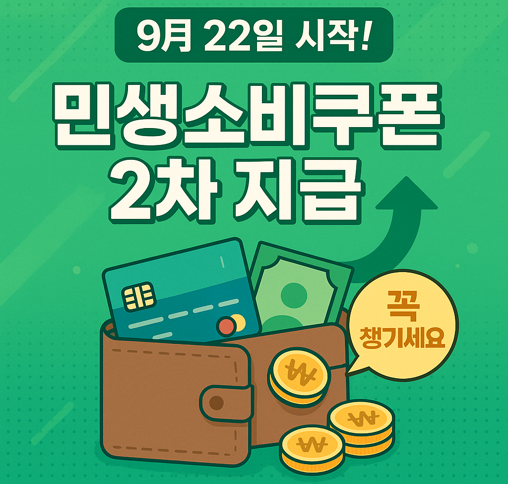 2025년 9월 22일부터 민생소비쿠폰 2차 지급이 시작됩니다. 소득 하위 90% 대상, 신청 방법, 지급액 계산법, 대리 신청 서류까지 한눈에 정리했습니다.
