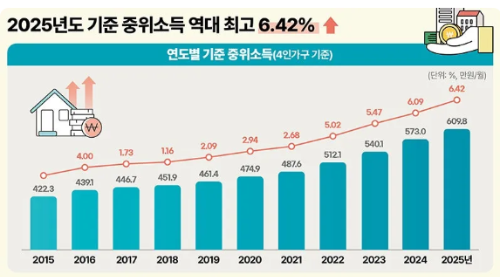 쉽게 말해, 전국 가구를 소득 순으로 나열했을 때 정확히 중간에 해당하는 값으로, 각종 지원 제도의 자격을 판별하는 기준이 됩니다.