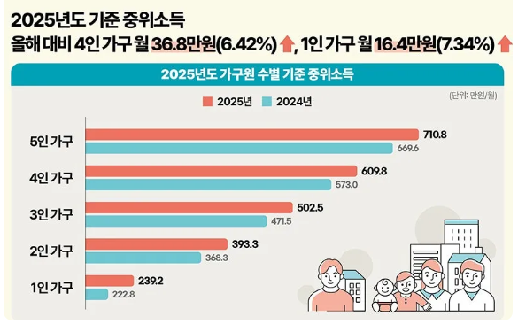 | 가구원 수 | 2025년 기준 중위소득 (월) | 저소득층 기준 (50%) |