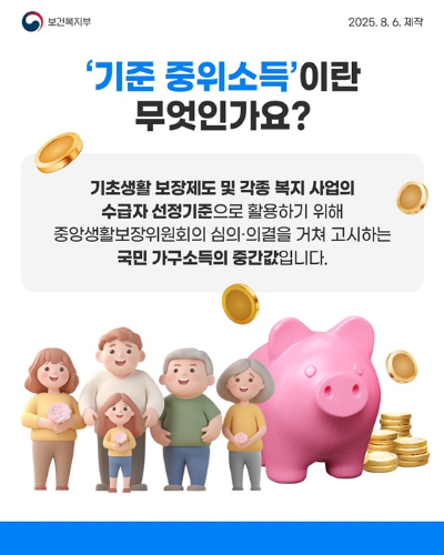 기준 중위소득은 정부가 매년 발표하는 복지 기준선입니다.