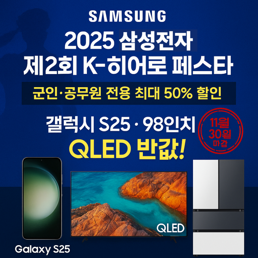 2025년 9월 21일부터 11월 30일까지 진행되는 삼성전자 ‘K-히어로 페스타’ 2회 행사. 군인·경찰·소방·교정 공무원을 대상으로 TV·냉장고·스마트폰 등 최신 제품을 최대 50% 할인해 드립니다. 추가 할인쿠폰과 카드 청구할인까지 적용되는 특별 혜택을 총정리했습니다.