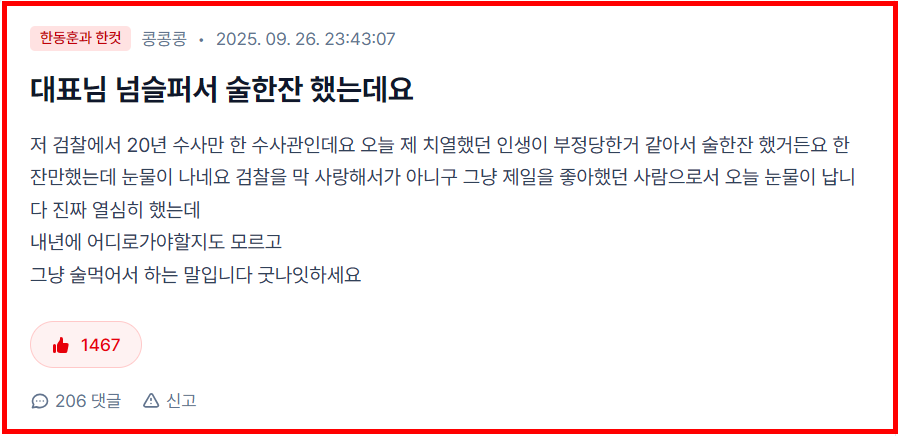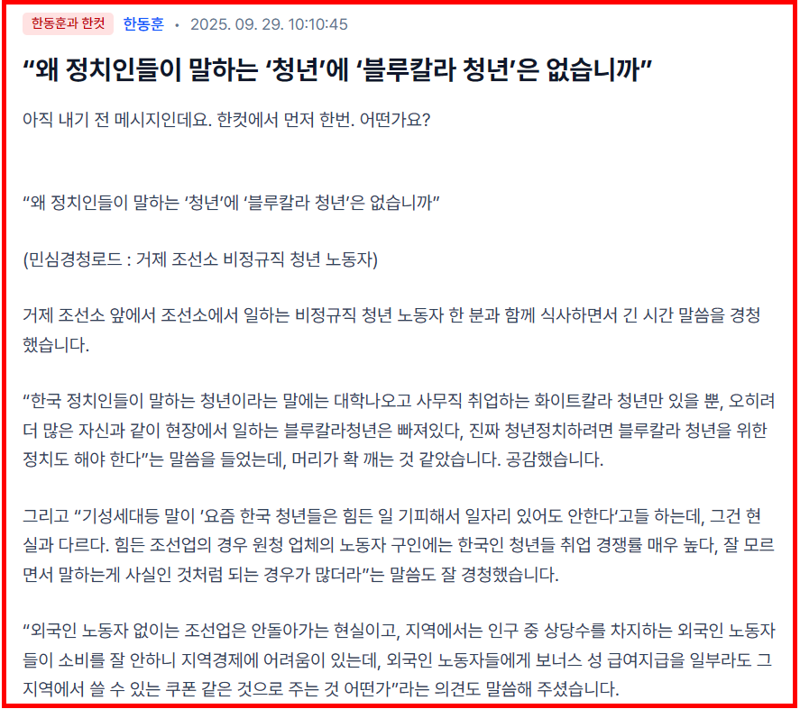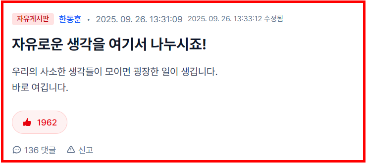 2025년 9월 개설 이후, 한동훈 전 대표가 직접 운영하며 글을 올리고 댓글로 답하는 독특한 구조 때문에 기존 SNS와는 전혀 다른 소통 방식이 형성되고 있습니다.