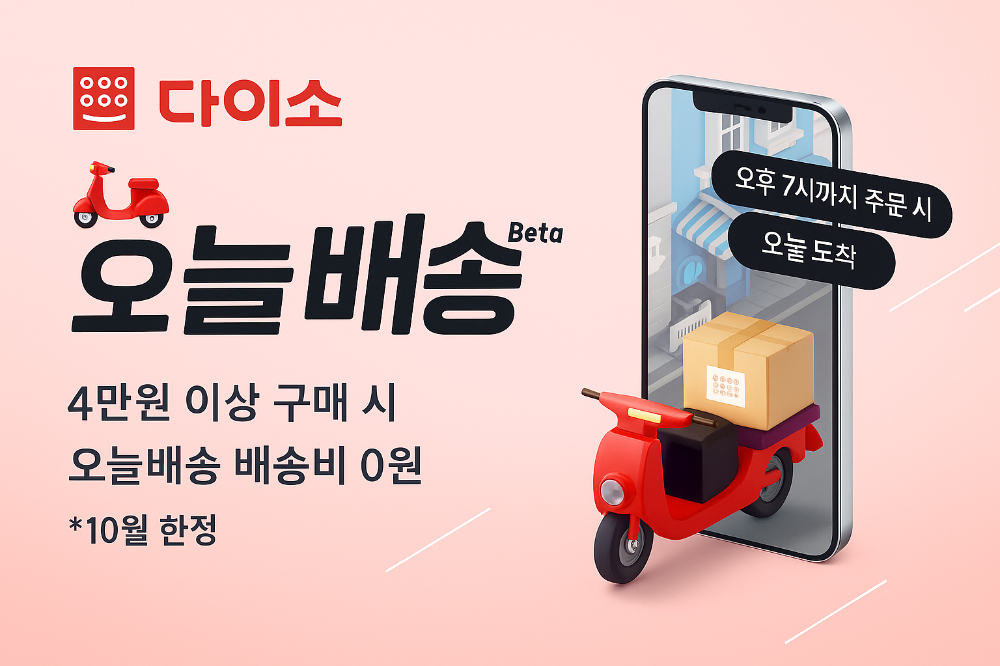 2025년 10월, 다이소 ‘오늘배송’이 돌아왔습니다. 서울 강남·서초·송파 지역 한정으로 4만원 이상 구매 시 배송비 0원! 오후 7시 전 주문하면 1~2시간 내 도착하는 초간편 당일배송 혜택을 지금 확인하세요.