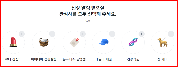 생활용품·패션·건강식품·펫 케어 등 6개 관심 분야 중 원하는 항목을 자유롭게 선택할 수 있습니다.