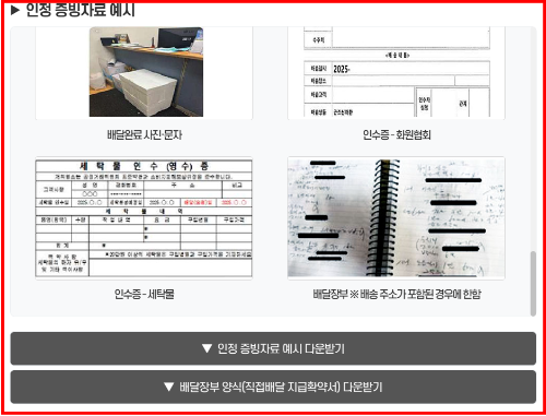 | 증빙 방식 | 자동매칭 (배달앱 데이터 연동) | 서류제출 (운송장·세금계산서 등) |