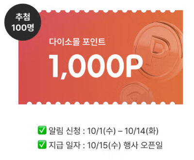 | 신청 기간 | 10월 1일(수) ~ 10월 14일(화) | 다이소몰 이벤트 페이지 내 알림 신청 |