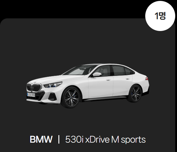 | BMW 530i | 1명 | 공식 BMW 딜러 출고 | 차량 색상 랜덤 배정 |