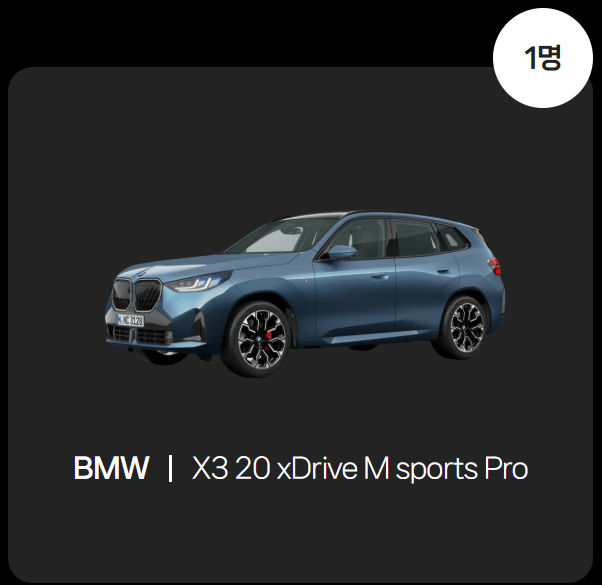 | BMW X3 | 1명 | 공식 BMW 딜러 출고 | 제세공과금 약 22% 납부 필수 |