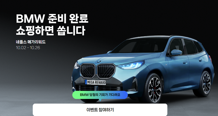 3만원 이상 결제 후 구매확정만으로 BMW 차량과 네이버페이 포인트 응모가 자동 누적되는 특별한 기회를 제공합니다.