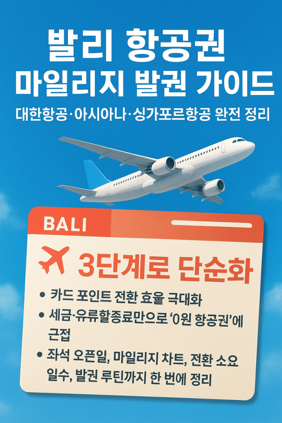 대한항공·아시아나·싱가포르항공 마일리지로 인천↔발리 왕복 항공권을 확보하는 방법. 좌석 오픈일, 마일리지 차트, 전환 소요일수, 발권 루틴까지 한 번에 정리했습니다.