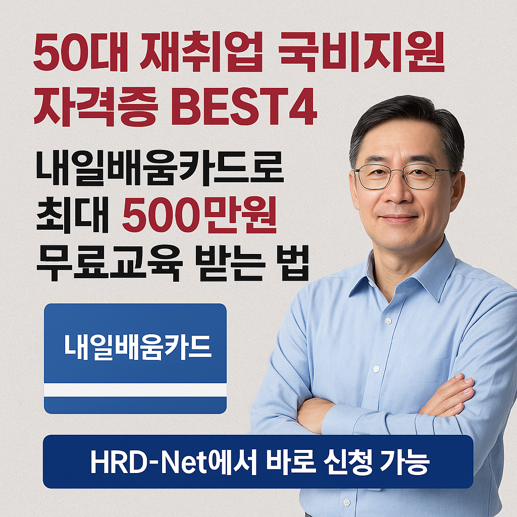 50대 재취업, 지금부터 시작하세요. 내일배움카드로 최대 500만원 무료교육 받고, 소방안전관리사·전기기능사·컴퓨터활용능력·AI활용 자격증으로 안정적인 인생 2막을 준비하세요. HRD-Net에서 바로 신청 가능합니다.