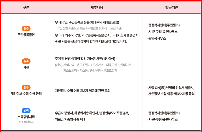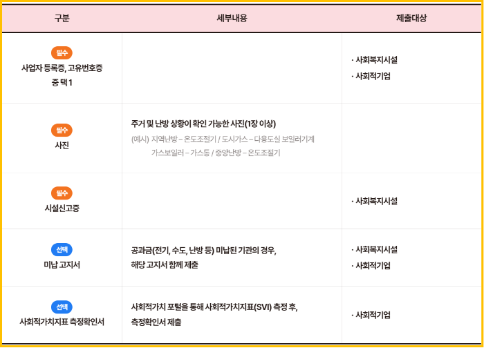 - 지원 항목: 도시가스비, 보일러 유지보수, 난방 설비 점검비 등