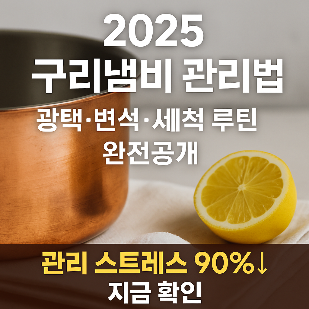 구리냄비 변색·산화·광택복원 고민 끝. 2025년 기준으로 가장 효과적인 ‘평생 유지 루틴’과 함께, 전문가들이 실제로 쓰는 관리템·세척템까지 정리했습니다. 초보자도 바로 따라 하는 실전 루틴으로 깨끗한 주방을 유지하세요.