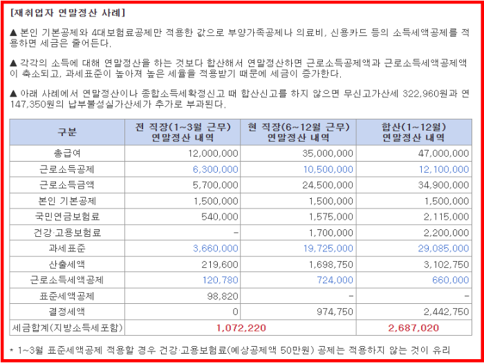 - 여러 회사의 근로소득이 연간 기준으로 정확히 합산됐는지