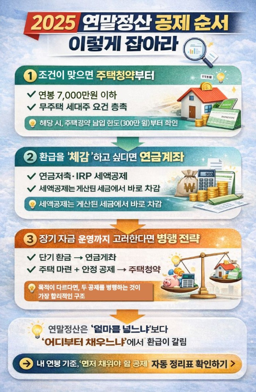 2025 연말정산 공제 한도 완전 정리|연금계좌·주택청약, 채우는 순서에 따라 환급이 달라집니다